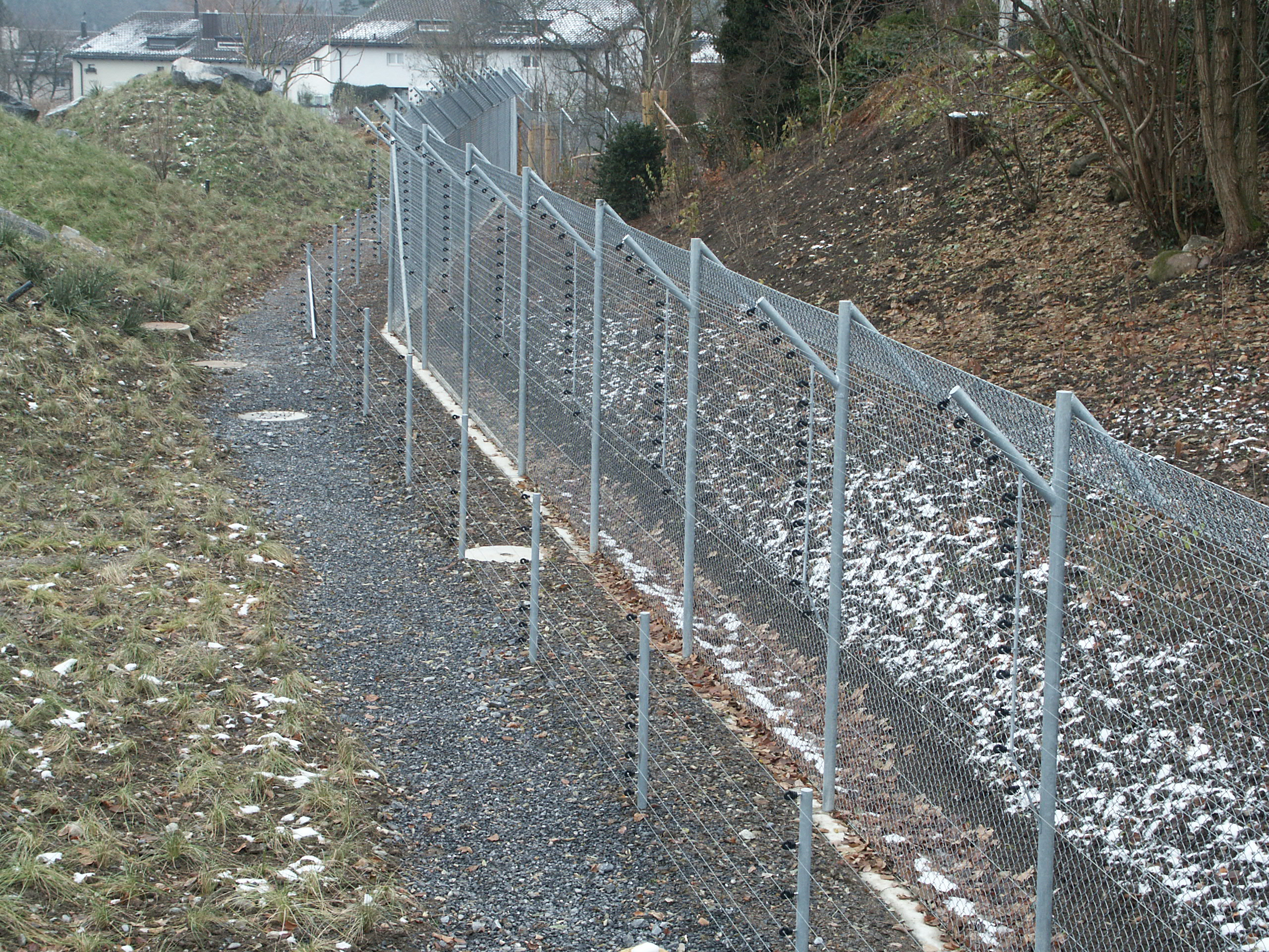 Der Zaun mit Abkröpfung bietet grösste Sicherheit für die Tiere im Gehege und hält sogleich alle Eindringlinge von aussen ab. Die Pfosten sind mit der Abkröpfung verschweisst und werden nach der Bearbeitung feuerverzinkt. Das Drahtgeflecht kann mit Stachel- oder zusätzlichem Elektrodraht ergänzt werden. Es wird 50 cm in die Erde eingegraben oder mit einem durchlaufenden Betonsockel versehen.