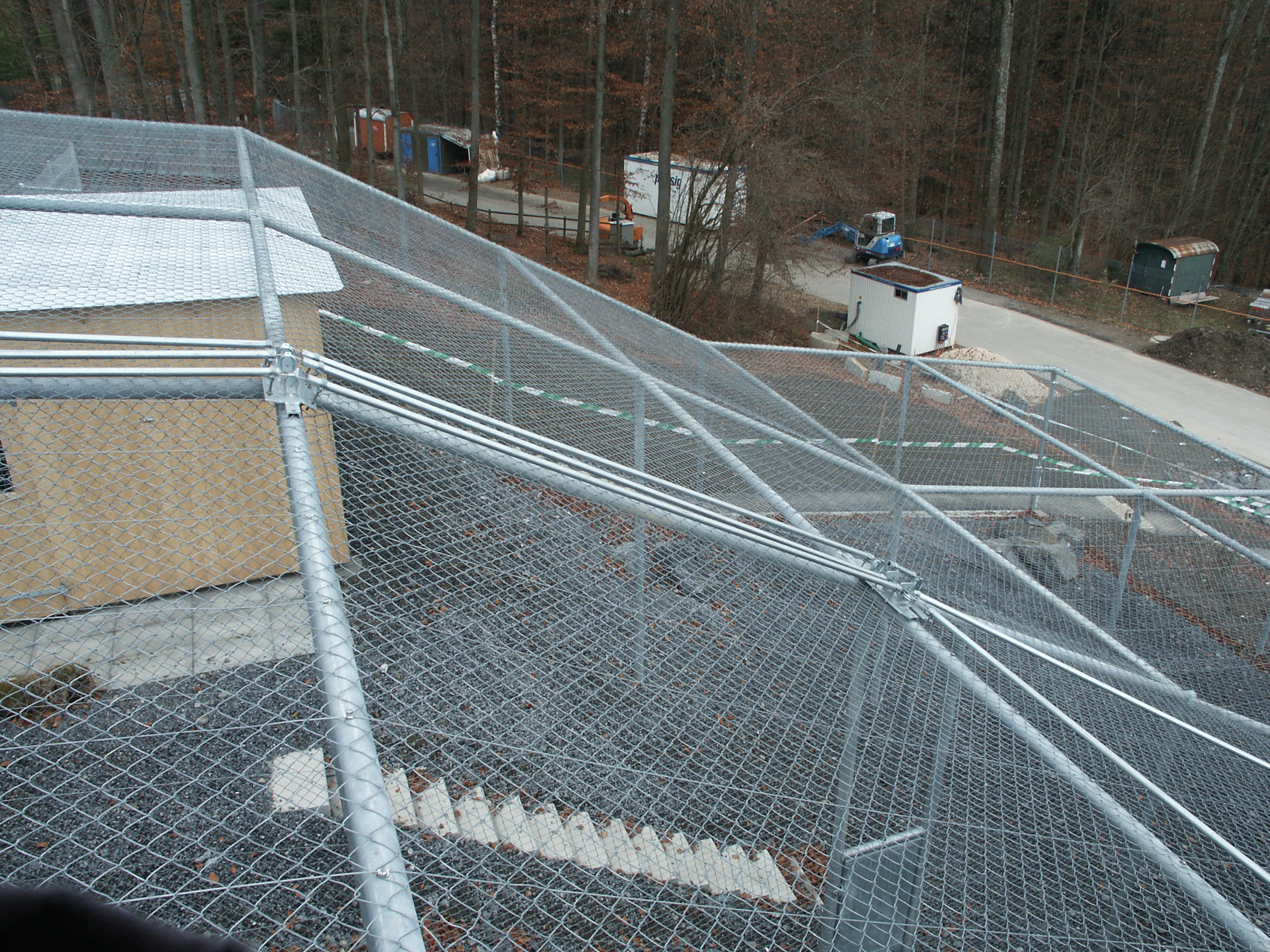 Eckpfosten ohne Diagonalstreben mit durchlaufendem Betonsockel unter der Erde. Pfosten Höhe 4.0m mit Abkröpfung, Länge = 1.0m. Diagonalgeflecht mit Drahtstärke 5mm und rostfreien Stahlseilen als Verstärkung. Pfosten und Geflecht sind auf Wunsch des Kunden feuerverzinkt oder in jeder RAL-Farbe erhältlich.